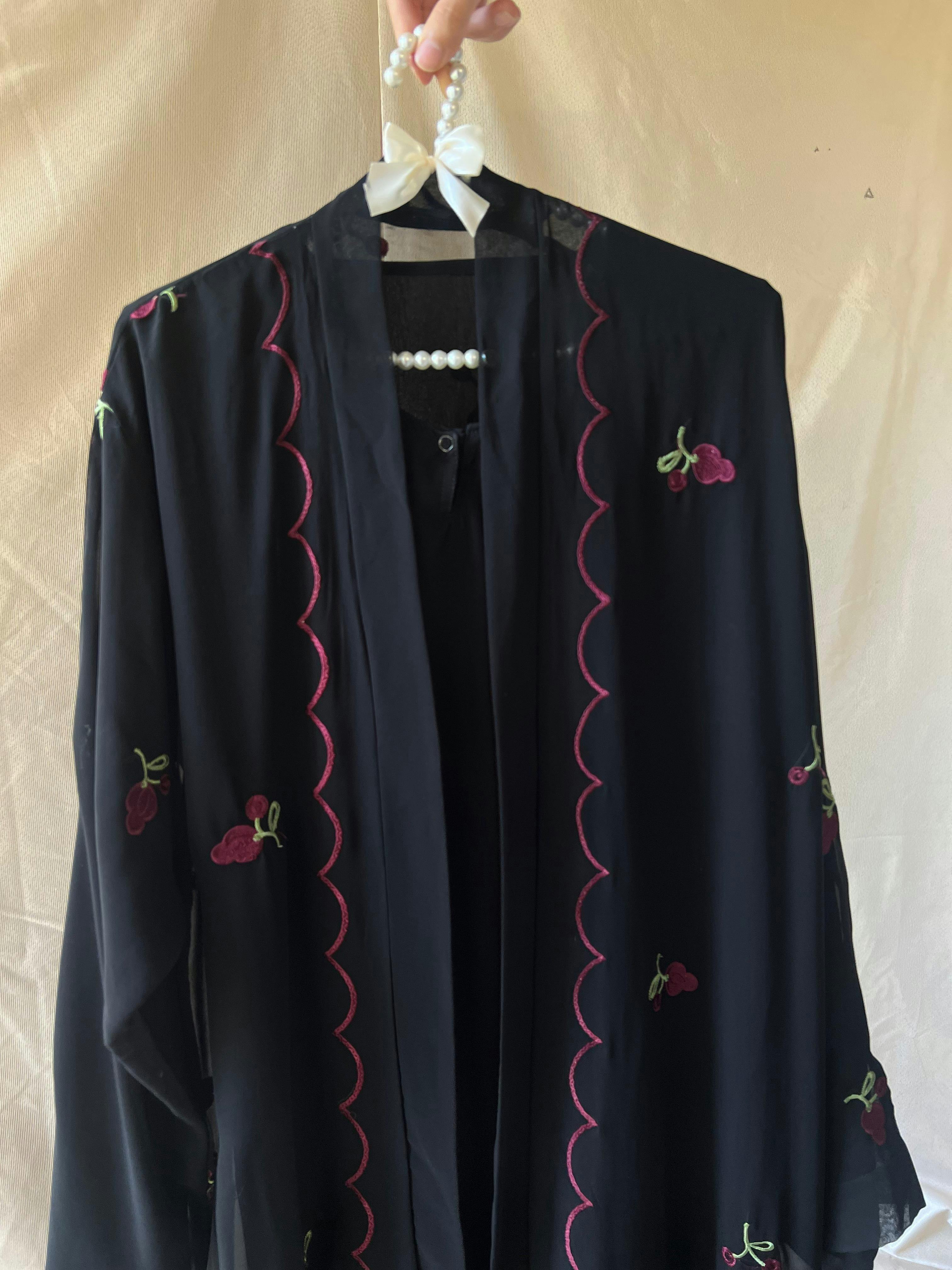 - Embroidered Open Abaya Coat: Features graceful floral and wave embroidery along the front, adding subtle femininity to classic black.